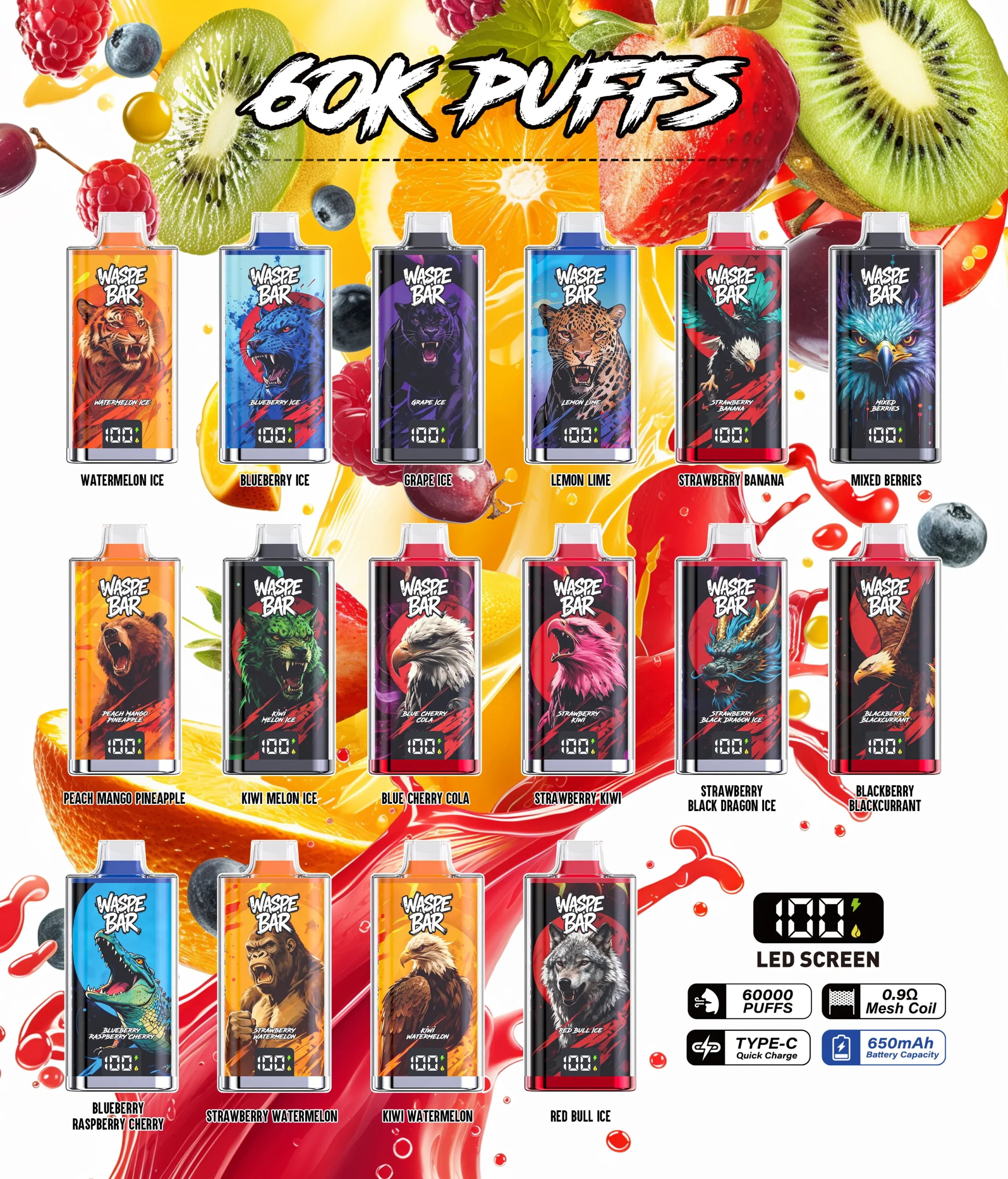 Výrazným prvkem je chytrý LED displej, což uživatelům umožňuje snadno sledovat stav baterie a udržovat plnou kontrolu nad zařízením. Ve spojení s rozmanitým výběrem příchutě inspirované ovocem, ledem a nápoji., Waspe Bar 60K přináší jemnou a konzistentní chuť při každém šluknutí.